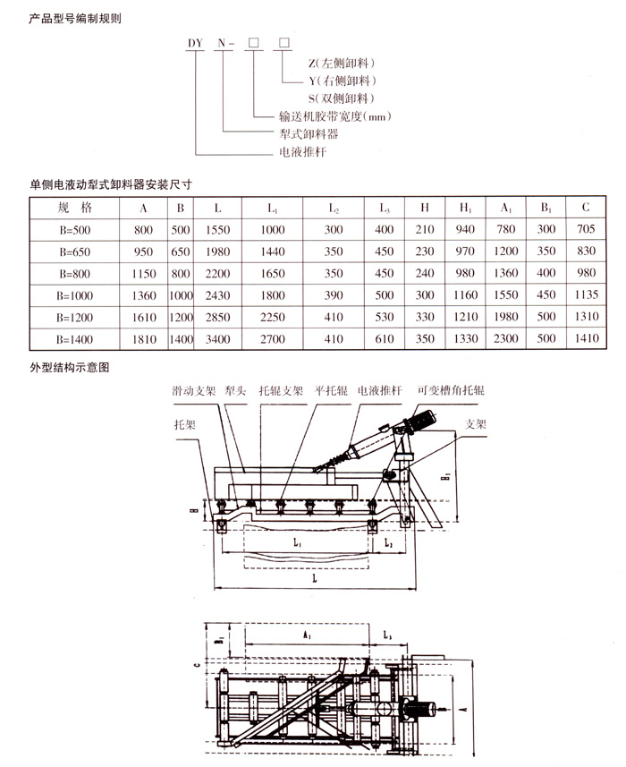 DYN-IV型電液動犁式卸料器,是我公司和電力部中南電力設(shè)計院聯(lián)合開發(fā)的產(chǎn)品之一,是安裝在膠帶輸送機(jī)上執(zhí)行卸料及控制物料輸送流量、流向的機(jī)械配套產(chǎn)品,可直接安裝在膠帶輸送機(jī)的中間架上,能將膠帶輸送的物料在中途均勻、連續(xù)地卸入漏斗(料斗)中,或卸到需要的場所去。